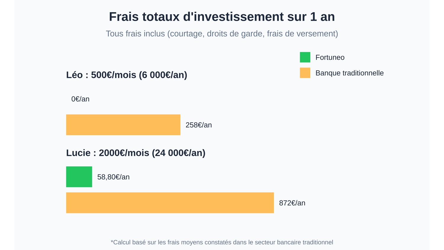 Dans le cas de Léo qui investit 500€ par mois, cela lui coûterait 0€ par an chez Fortuneo contre en moyenne 258€ par an dans une banque traditionnelle (15€ l'ordre, 0,30% de droits de garde et 2,5% de frais de versement).