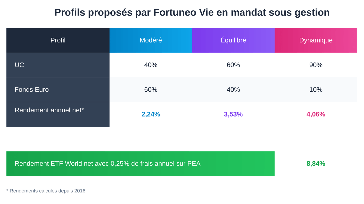 Je me suis amusé à vous présenter le rendement net annualisé de l’ETF World par rapport aux rendements nets des assurances-vie sous gestion pilotée de Fortuneo. Bien que je conçois qu’on compare des carottes à des tomates, il n’y a pas photo sur les résultats.