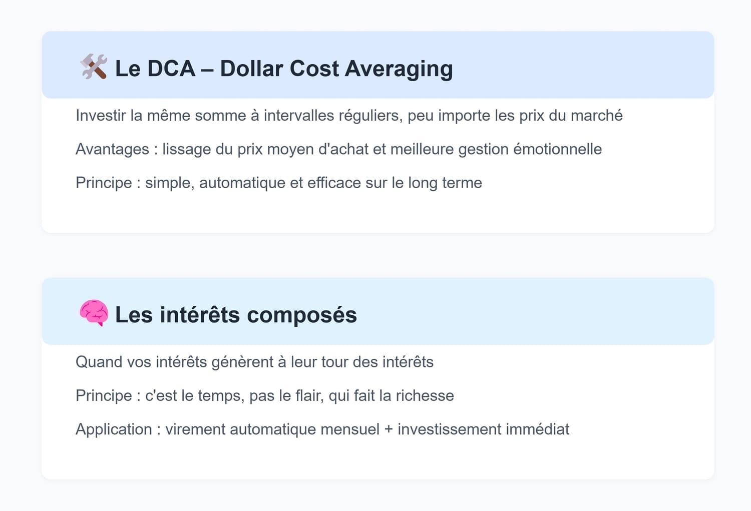 Le DCA, c’est le fait d’investir à intervalle régulier, toujours le même montant, peu importe le prix. Vous achetez quand c’est bas, vous achetez quand c’est haut. Peu importe car sur le long terme, vous lissez le prix moyen d’achat. C’est simple, automatique et terriblement efficace.