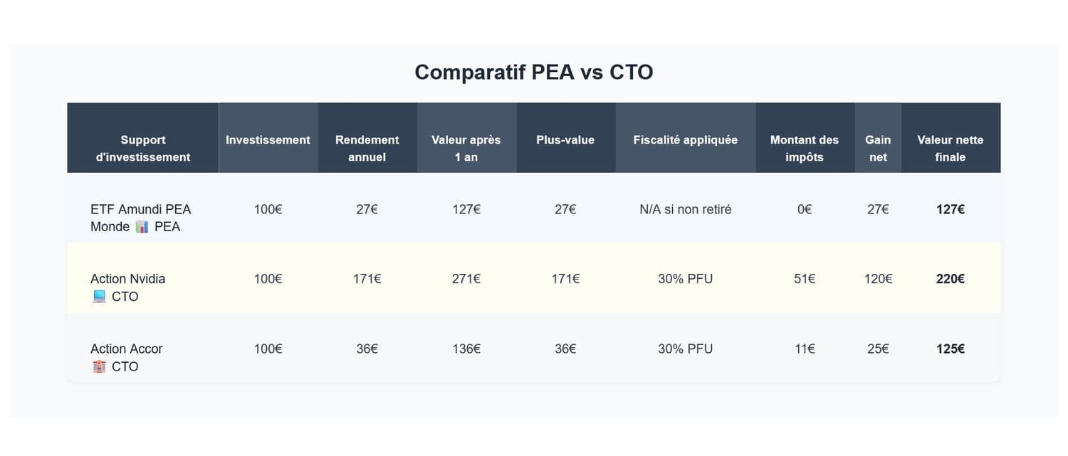 Mais attention, ce type d’investissement se fait via un compte titres ordinaire (CTO). Et ça change tout sur le plan fiscal. Les plus-values que vous réalisez seront imposables dès le 1er euro. Ce n’est pas bloquant, mais ce n’est clairement pas optimisé fiscalement. Le PEA, lui, offre une vraie alternative avec une fiscalité allégée après 5 ans et sans impôt sur le revenu.